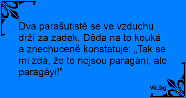 Dva parašutisté se ve vzduchu drží za zadek. Děda na to kouká a znechuceně konstatuje: „Tak se mi zdá, že to nejsou paragáni, ale paragáyi!”