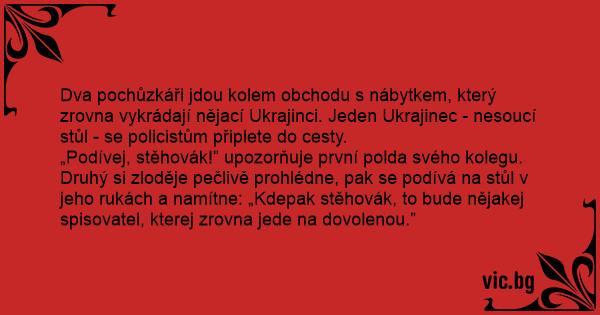 Druhý si zloděje pečlivě prohlédne, pak se podívá na stůl v jeho rukách a namítne: „Kdepak stěhovák, to bude nějakej spisovatel, kterej zrovna jede na dovolenou.”