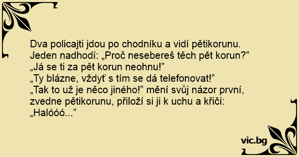 Dva policajti jdou po chodníku a vidí pětikorunu. Jeden nadhodí: „Proč nesebereš těch pět korun?”