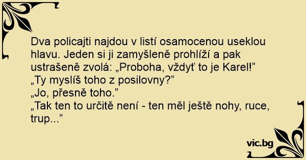 Dva policajti najdou v listí osamocenou useklou hlavu. Jeden si ji zamyšleně prohlíží a pak ustrašeně zvolá: „Proboha, vždyť to je Karel!”