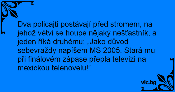 Dva policajti postávají před stromem, na jehož větvi se houpe nějaký nešťastník, a jeden říká druhému: „Jako důvod sebevraždy napíšem MS 2005. Stará mu při finálovém zápase přepla televizi na mexickou telenovelu!”