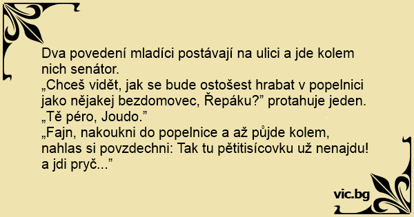 Dva povedení mladíci postávají na ulici a jde kolem nich senátor.