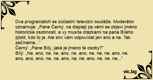Dva programátoři se zúčastní televizní soutěže. Moderátor oznamuje: „Pane Černý, na displeji za vámi se objeví jméno historické osobnosti, a vy musíte otázkami na pana Bílého zjistit, kdo to je. Ale smí vám odpovídat jen ano a ne. Tak začínáme...”