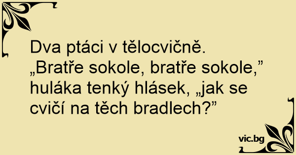 „Bratře sokole, bratře sokole,” huláka tenký hlásek, „jak se cvičí na těch bradlech?”