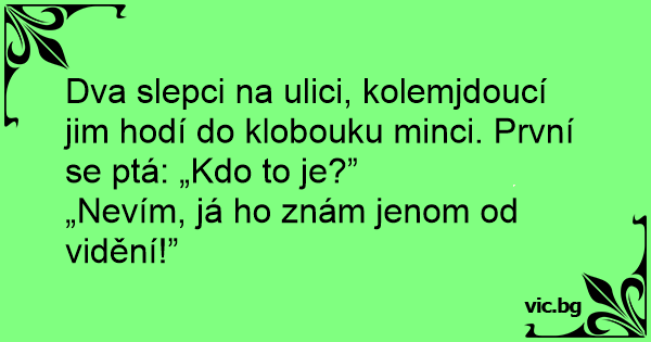 Dva slepci na ulici, kolemjdoucí jim hodí do klobouku minci. První se ptá: „Kdo to je?”