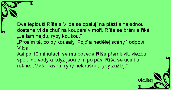 Dva teplouši Ríša a Vilda se opalují na pláži a najednou dostane Vilda chuť na koupání v moři. Ríša se brání a říká: „Já tam nejdu, ryby koušou.”