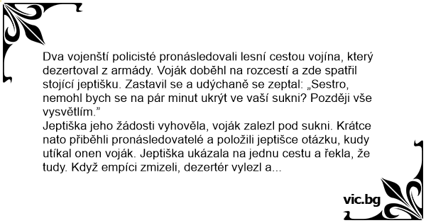 Dva vojenští policisté pronásledovali lesní cestou vojína, který dezertoval z armády. Voják doběhl na rozcestí a zde spatřil stojící jeptišku. Zastavil se a udýchaně se zeptal: „Sestro, nemohl bych se na pár minut ukrýt ve vaší sukni? Později vše vysvětlím.”