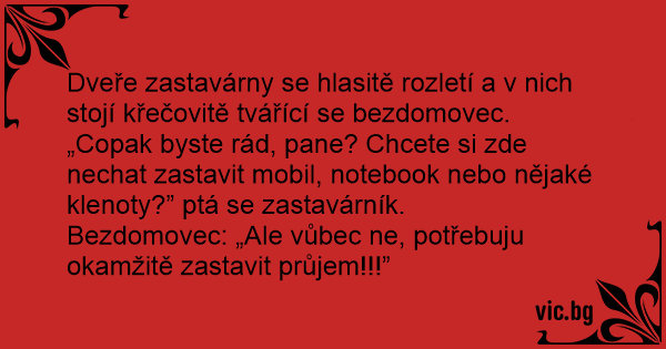 Dveře zastavárny se hlasitě rozletí a v nich stojí křečovitě tvářící se bezdomovec.