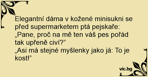 Elegantní dáma v kožené minisukni se před supermarketem ptá pejskaře: „Pane, proč na mě ten váš pes pořád tak upřeně civí?”