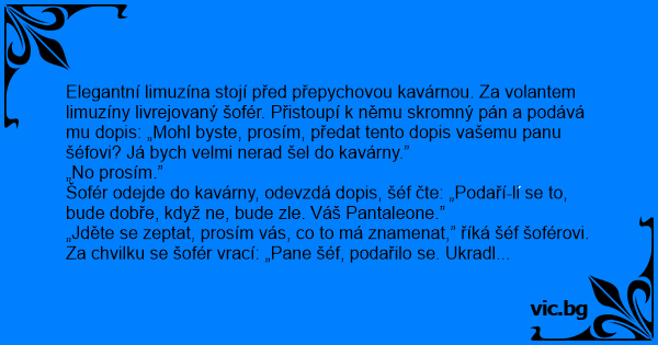 Elegantní limuzína stojí před přepychovou kavárnou. Za volantem limuzíny livrejovaný šofér. Přistoupí k němu skromný pán a podává mu dopis: „Mohl byste, prosím, předat tento dopis vašemu panu šéfovi? Já bych velmi nerad šel do kavárny.”