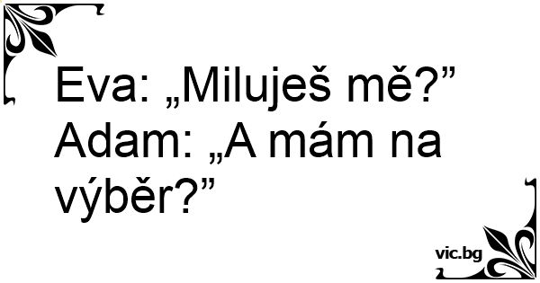 Adam en Eva lopen door hun paradijs wanneer Eva ineens vraagt “Adam, hou jij nog steeds van mij?” waarop Adam antwoordt “Ja natuurlijk, van wie anders?”