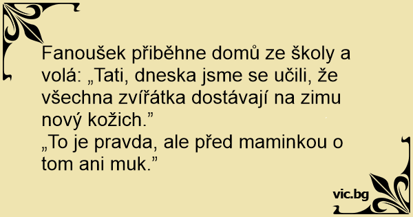 Fanoušek přiběhne domů ze školy a volá: „Tati, dneska jsme se učili, že všechna zvířátka dostávají na zimu nový kožich.”