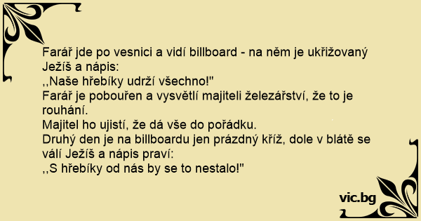 Farář jde po vesnici a vidí billboard - na něm je ukřižovaný Ježíš a nápis: