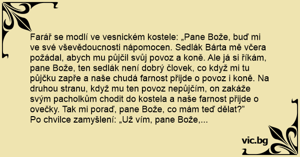 Farář se modlí ve vesnickém kostele: „Pane Bože, buď mi ve své vševědoucnosti nápomocen. Sedlák Bárta mě včera požádal, abych mu půjčil svůj povoz a koně. Ale já si říkám, pane Bože, ten sedlák není dobrý človek, co když mi tu půjčku zapře a naše chudá farnost přijde o povoz i koně. Na druhou stranu, když mu ten povoz nepůjčím, on zakáže svým pacholkům chodit do kostela a naše farnost přijde o ovečky. Tak mi poraď, pane Bože, co mám teď dělat?”