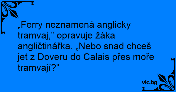 „Ferry neznamená anglicky tramvaj,” opravuje žáka angličtinářka. „Nebo snad chceš jet z Doveru do Calais přes moře tramvají?”