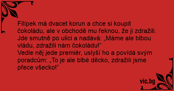 Filípek má dvacet korun a chce si koupit čokoládu, ale v obchodě mu řeknou, že ji zdražili. Jde smutně po ulici a nadává: „Máme ale blbou vládu, zdražili nám čokoládu!”