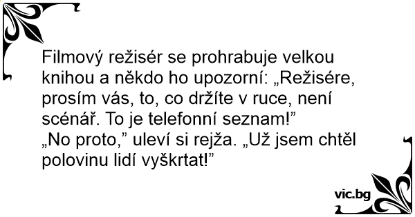 Filmový režisér se prohrabuje velkou knihou a někdo hо upozorní: „Režisére, prosím vás, to, co držíte v ruce, není scénář. To je telefonní seznam!”