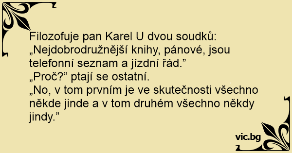 Filozofuje pan Karel U dvou soudků: „Nejdobrodružnější knihy, pánové, jsou telefonní seznam a jízdní řád.”