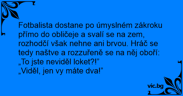 Fotbalista dostane po úmyslném zákroku přímo do obličeje a svalí se na zem, rozhodčí však nehne ani brvou. Hráč se tedy naštve a rozzuřeně se na něj oboří: „To jste neviděl loket?!”