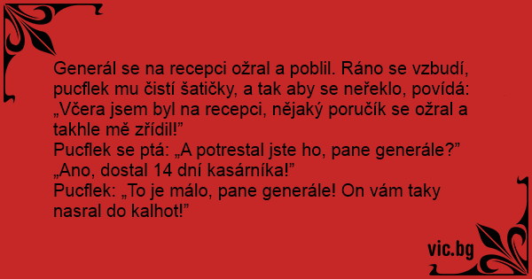Generál se na recepci ožral a poblil. Ráno se vzbudí, pucflek mu čistí šatičky, a tak aby se neřeklo, povídá: „Včera jsem byl na recepci, nějaký poručík se ožral a takhle mě zřídil!”