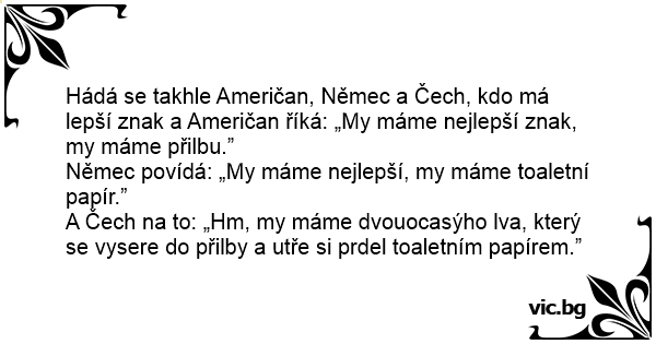 Hádá se takhle Američan, Němec a Čech, kdo má lepší znak a Američan říká: „My máme nejlepší znak, my máme přilbu.”