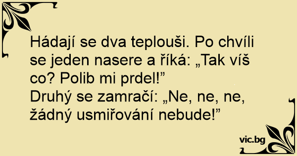 Hádají se dva teplouši. Po chvíli se jeden nasere a říká: „Tak víš co? Polib mi prdel!”