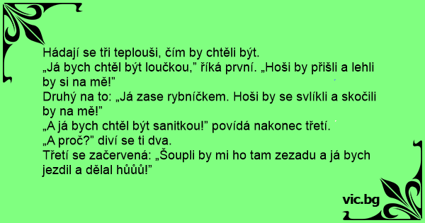 „Já bych chtěl být loučkou,” říká první. „Hoši by přišli a lehli by si na mě!”