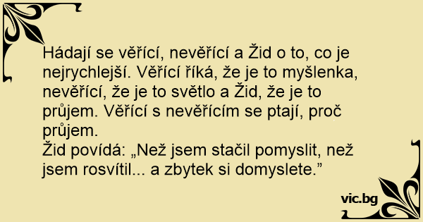 Hádají se věřící, nevěřící a Žid o to, co je nejrychlejší. Věřící říká, že je to myšlenka, nevěřící, že je to světlo a Žid, že je to průjem. Věřící s nevěřícím se ptají, proč průjem.