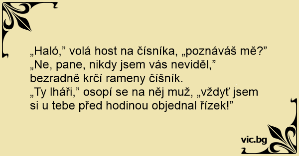 „Ty lháři,” osopí se na něj muž, „vždyť jsem si u tebe před hodinou objednal řízek!”