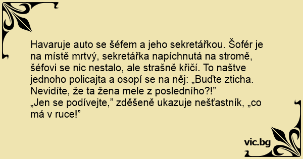 Havaruje auto se šéfem a jeho sekretářkou. Šofér je na místě mrtvý, sekretářka napíchnutá na stromě, šéfovi se nic nestalo, ale strašně křičí. To naštve jednoho policajta a osopí se na něj: „Buďte zticha. Nevidíte, že ta žena mele z posledního?!”