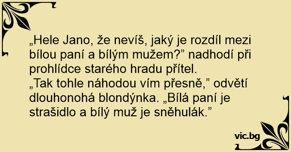 „Hele Jano, že nevíš, jaký je rozdíl mezi bílou paní a bílým mužem?” nadhodí při prohlídce starého hradu přítel.