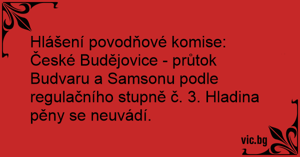 Hlášení povodňové komise: České Budějovice - průtok Budvaru a Samsonu podle regulačního stupně č. 3. Hladina pěny se neuvádí.