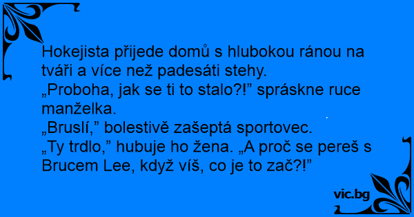 „Ty trdlo,” hubuje hо žena. „A proč se pereš s Brucem Lee, když víš, co je to zač?!”