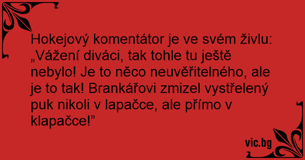 Hokejový komentátor je ve svém živlu: „Vážení diváci, tak tohle tu ještě nebylo! Je to něco neuvěřitelného, ale je to tak! Brankářovi zmizel vystřelený puk nikoli v lapačce, ale přímo v klapačce!”