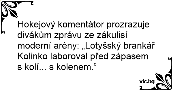 Hokejový komentátor prozrazuje divákům zprávu ze zákulisí moderní arény: „Lotyšský brankář Kolinko laboroval před zápasem s kolí... s kolenem.”