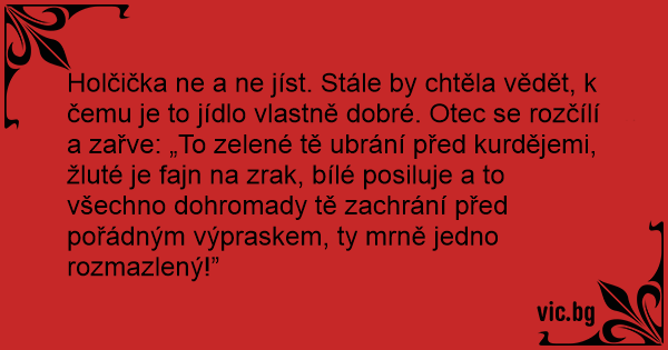 Holčička ne a ne jíst. Stále by chtěla vědět, k čemu je to jídlo vlastně dobré. Otec se rozčílí a zařve: „To zelené tě ubrání před kurdějemi, žluté je fajn na zrak, bílé posiluje a to všechno dohromady tě zachrání před pořádným výpraskem, ty mrně jedno rozmazlený!”