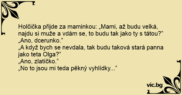 Holčička přijde za maminkou: „Mami, až budu velká, najdu si muže a vdám se, to budu tak jako ty s tátou?”