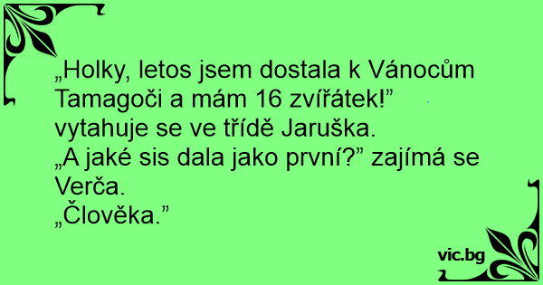 „Holky, letos jsem dostala k Vánocům Tamagoči a mám 16 zvířátek!” vytahuje se ve třídě Jaruška.