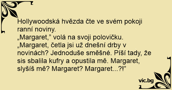 „Margaret,” volá na svoji polovičku. „Margaret, četla jsi už dnešní drby v novinách? Jednoduše směšné. Píší tady, že sis sbalila kufry a opustila mě. Margaret, slyšíš mě? Margaret? Margaret...?!”