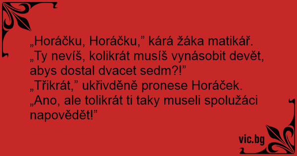 „Horáčku, Horáčku,” kárá žáka matikář. „Ty nevíš, kolikrát musíš vynásobit devět, abys dostal dvacet sedm?!”