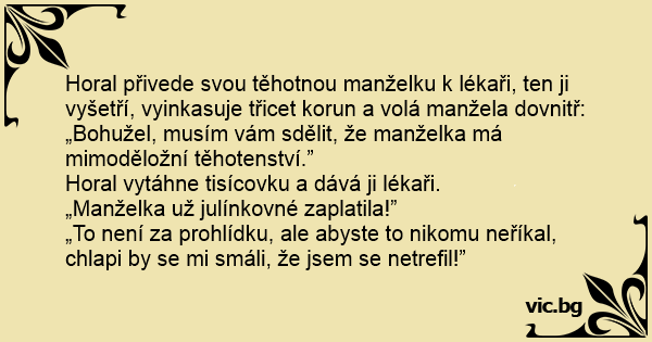 Horal přivede svou těhotnou manželku k lékaři, ten ji vyšetří, vyinkasuje třicet korun a volá manžela dovnitř: „Bohužel, musím vám sdělit, že manželka má mimoděložní těhotenství.”
