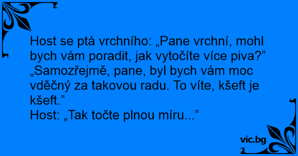 Host se ptá vrchního: „Pane vrchní, mohl bych vám poradit, jak vytočíte více piva?”