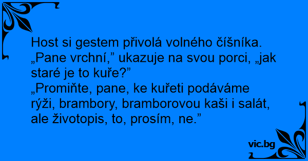 „Pane vrchní,” ukazuje na svou porci, „jak staré je to kuře?”