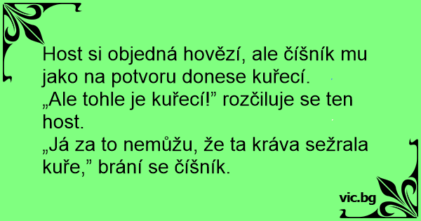 „Já za to nemůžu, že ta kráva sežrala kuře,” brání se číšník.