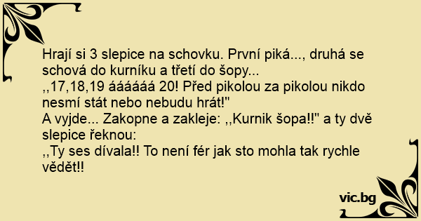 Hrají si 3 slepice na schovku. První piká..., druhá se schová do kurníku a třetí do šopy...