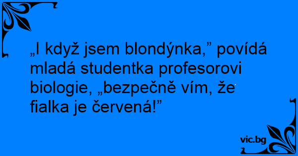 „I když jsem blondýnka,” povídá mladá studentka profesorovi biologie, „bezpečně vím, že fialka je červená!”
