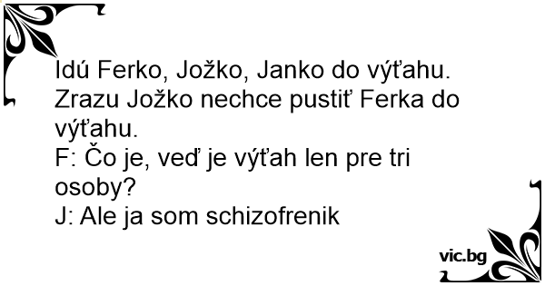 Idú Ferko, Jožko, Janko do výťahu. Zrazu Jožko nechce pustiť Ferka do výťahu.