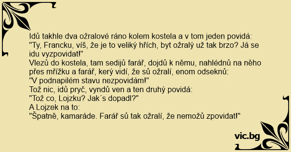 "Ty, Francku, víš, že je to veliký hřích, byt ožralý už tak brzo? Já se idu vyzpovidat!"