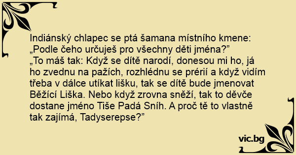 Indiánský chlapec se ptá šamana místního kmene: „Podle čeho určuješ pro všechny děti jména?”