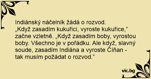 Přijde Ind na úřad v hlavním městě a povídá: „Sáhibe, já se chci rozvést.” Úředník se na něj přísně podívá a odvětí: „To není jen tak, musíš k tomu mít nějaký důvod.” Ind se zamyslí a říká:...